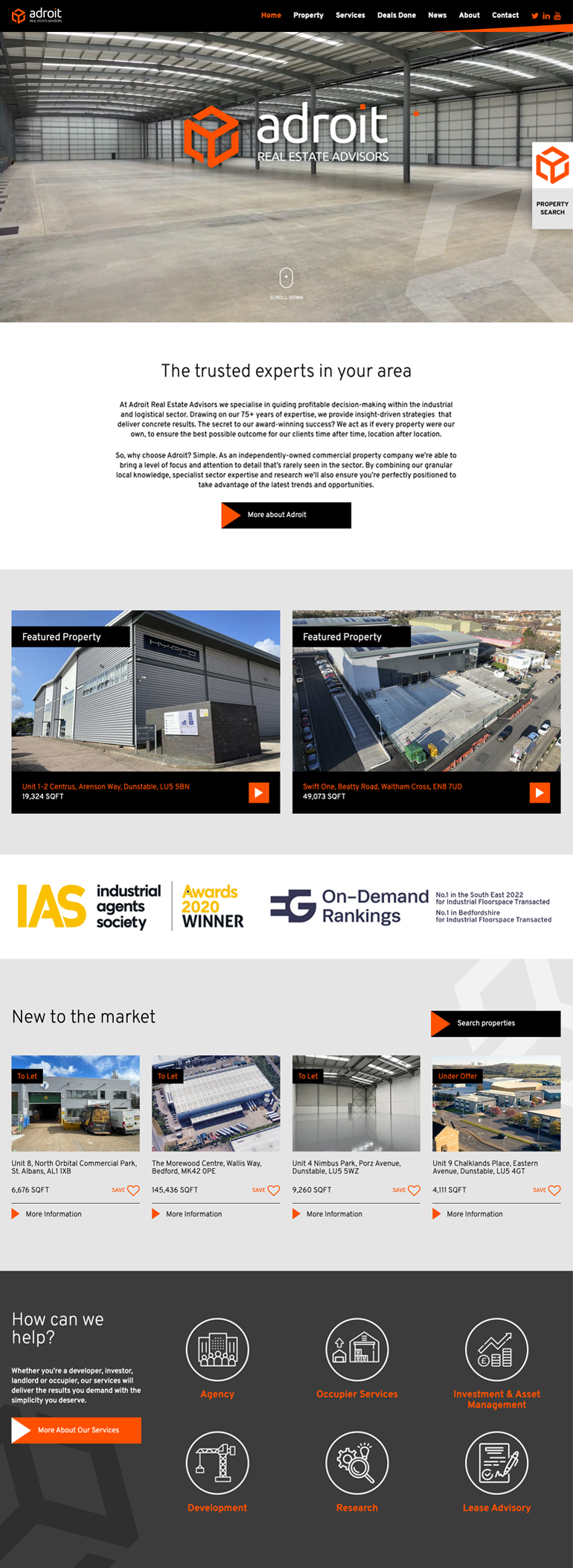 Adroit, leading sales agents for logistics and warehouse properties in and around London, approached us for a comprehensive overhaul of their existing website.